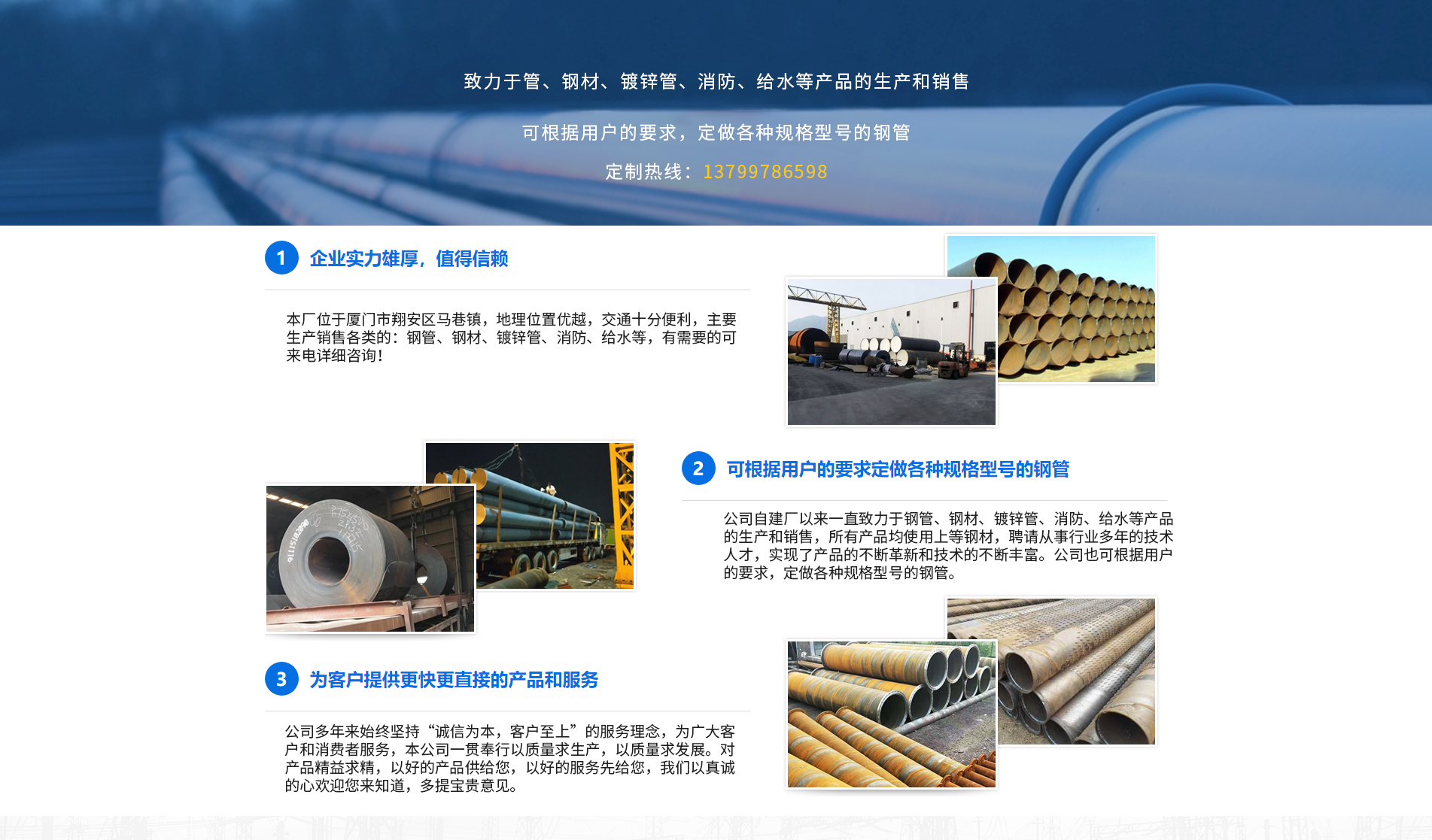 廈門方圓澤金屬材料有限公司主要生產銷售各類銀澤的:鋼管、鋼材、鍍鋅管、消防、給水等,產品被廣泛應用于天然氣、石油、化工、電力、熱力管網、水源等長距離輸送管道等,公司建立起了產品售前、售后服務規范,全過程滿足顧客要求,使我們的產品和服務深得顧客的信賴,與顧客建立起了長期合作互利關系。